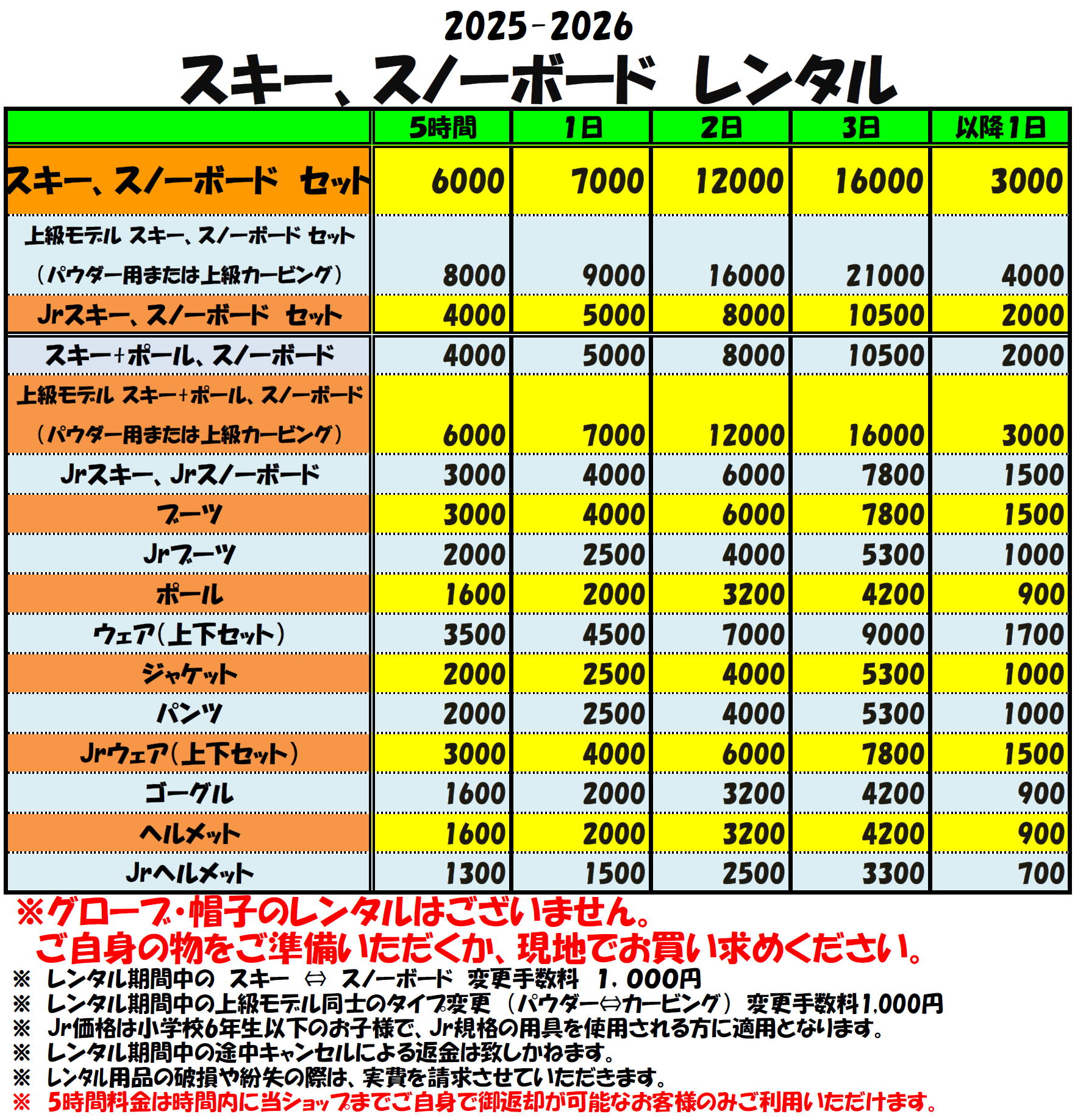 ※上記価格には消費税が含まれます。 ※スキーセットはスキー・ポール・ブーツの3点、 スノーボードセットはスノーボード・ブーツの2点セットです。 ※エキスパートカービング、ファットスキー、パウダー用ボードは上級モデルスキーの価格となります。